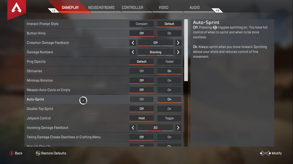 Next up, we love Auto-Sprint in almost every game that it’s available. While this may seem wonky at first, the amount of force required to click in that left stick to sprint degrades the integrity of the joystick mechanism over time, which can cause severe input issues like stick drift and jitter. By enabling Auto-Sprint, you will improve your mid-fight movement and increase the lifespan of your controller, especially if you are using a pair of Apex Legends Performance Thumbsticks, which reduce the amount of downward force you need to push that thumbstick forward, so you can move around the battlefield with ease.