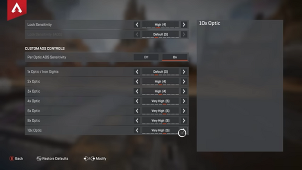 Again, depending on the controller you use, you may want to turn up the deadzones, if your controller is picking up stick drift or jitter. If you choose to turn on Custom Look Controls, you will have a bunch of additional controller settings to customize. You can customize your Deadzone to an exact value, enabling you to go in to the map and determine the lowest Deadzone value that you can use without experiencing unprompted cursor movement on the map. We recommend setting your Deadzone between 5% and 10% depending on your controller, and the outer threshold to at least 2%. Keeping the deadzone setting low will enable your controller to pick up fine adjustment to your aim. This is especially important when utilizing KontrolFreek’s Apex Legends Performance Thumbsticks, as the raised stick height increases the aiming arc, allowing you to make finer adjustments.