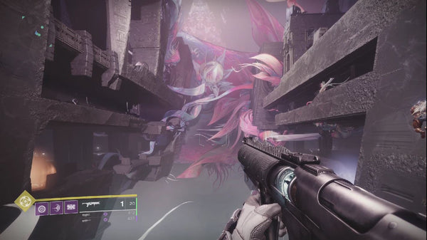 Once you reach the raid banner, stop and gather your team before moving forward. In this encounter, 2 runners will be using a similar mechanic to the runner(s) in the last encounter, but this time one of the runners will be grabbing a light orb and buff and the other runner will be grabbing a dark orb and buff. Standing in the glowing orange aura and shooting the orb will give you and anyone next to you the “Flux of Darkness” buff. So split up into 2 teams, one on the dark orb side and one on the light orb side. To start the encounter, all 3 players on each side will stand in the aura, and the runner will shoot the orb to give everyone the corresponding buff and find out where their next orb is. You’ll see a timer for about a minute for the runners to finish their runs on each floor. Runners will need to use the launchpads to cross the chasm to get to their next orbs. While runners are getting their orbs, ad clearers will stay in or near the aura killing enemies. Eventually your runner will get back and need to reactive their buff. Ad clearers need to be standing in the aura with the runners every time they shoot the orb to get the buff, which you will need to be able to damage special enemies with the matching aura to your side. Once both runners have finished their runs, the timer will stop and a new launchpad will open up to launch the players on your side to the next floor. Rinse and repeat on two more floors. To put it lightly, these launch pads are…not the best. They will sometimes launch you perfectly, sometimes way short and you need to jump and other times you will bump a teammate and fly off a completely different direction. This can be very annoying, especially while on a timer. Our recommendation is to use jump or glide right after launching to extend your upward trajectory, but even with doing this, you can still launch into the wall and die. Runners can use a sword with eager edge to ensure they make it across safely