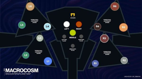 Encounter 3, which the community has unofficially renamed “Planets”, for obvious reasons, is widely considered to be the best encounter in this raid, and we agree with that consensus. This room is aesthetically pleasing, the mechanics work with minimal bugs and the damage check is significant enough to test most raid teams. When we first enter the room, you will see 6 planets on the left, 6 on the right, and 3 in the middle. This diagram shows the layout of the planets as well as an example of what the callouts can be for each planet. There are other versions of this callout system, so be sure to discuss with your team which callouts refer to which planets before you start. For example, our raid team refers to planets 1 and 4 here as “top” and then the other 2 planets on each plate become “left” and “right” but use whatever callout system makes the most sense for your team.
