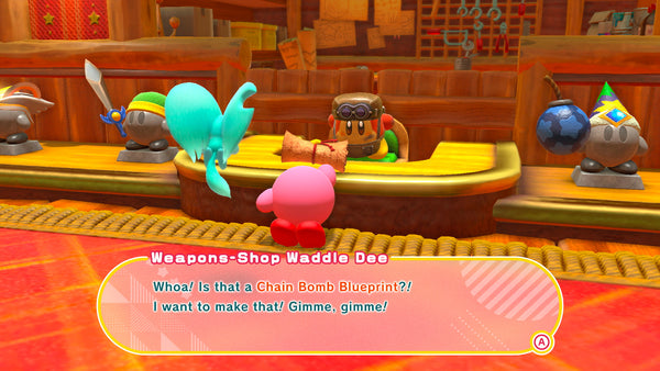 In addition to the new set of Mouthful Mode abilities, Kirby can still use the same Copy Abilities he's always been able to. That includes Fire and Sword, both of which we've seen in other games throughout the Kirby universe. This time around, however, Kirby can go to Waddle Dee's Weapon Shop and level up his Copy Abilities and make them even more powerful.