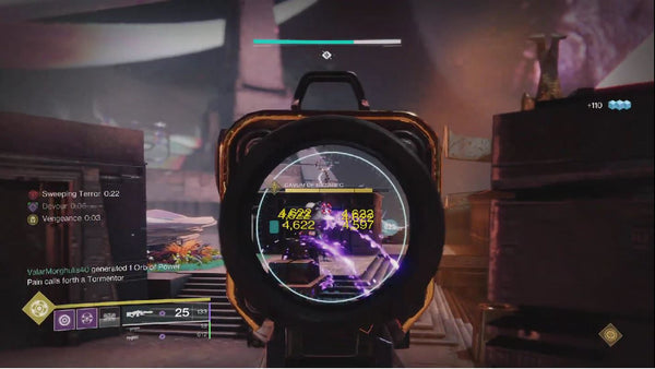 Killing a tormentor will add 30 seconds to Sweeping Terror and prevent the team from wiping. So if that timer is getting close, communicate who should use a super to finish it off. Depending on how fast you completed this, new psions will either spawn right away, or as soon as Sweeping Terror gets down to 30 seconds again. These psions will be further away from the raid banner as you work your way forward in the room throughout the encounter, punching psions and melting tormentors to avoid that wipe mechanic. Your team will need 1 or 2 runners to handle the “Field of Light” mechanic. We ran this with 1 runner, so we’ll be giving advice for that strategy. Start this off by standing in the light aura and shooting the traveler orb to start the encounter and give yourself “Field of Light” for 15 seconds. Then follow the beam of light that came off of the starting traveler orb to another plate. The correct plate will have a small purple orb that you can shoot to consume your Field of Light buff. Runner(s) then have to return to a traveler orb, shoot it to reacquire the “Field of Light” buff, track down the purple orb it leads to, and shoot that orb several more times until you see the text “His Hatred Halts” which means you’ve completed 1 of 3 phases. Your team should move up in the room then rinse and repeat. Be aware that the room gets tighter and with less cover towards the end so saving a well or two for that final phase is a good idea. We used one runner and 5 ad clearers because the biggest challenge here is that Sweeping Terror timer. If you spawn a tormentor with 10 seconds left, you need 5 guardians and some supers to take it out. Better safe than sorry when it comes to using supers on those tormentors, but good teams will communicate when to use supers, so that no one wastes one. Whenever Sweeping Terror hits 30 seconds, ask your runner if they are close. If they are almost done with their orbs, you don’t need to hit the psions and spawn the tormentor, which will help your team stay alive. Alternatively, if you accidentally spawn a tormentor while his hatred is “halted”, don’t kill it, as doing so will waste that +30seconds while the timer is not active. Instead, have someone kite the tormentor and keep it alive until the timer starts back up again, then kill it to give yourself a long window to clear ads and prepare for the next psions and tormentor. Runners should run something with high mobility and automatic fire to make hitting those orbs easier. Ad clearers should take advantage of whatever builds help them kill ads, stay alive, and make orbs. Damage dealing supers are preferred but Well of Radiance will help, especially towards the end. Our recommendation is to take advantage of the seasonal artifact mods and run a void machine gun. Bricks from Beyond will give you tons of ammo and Void Weapon Channeling and Volatile rounds will make any void machine gun an ad clearing machine in this encounter.