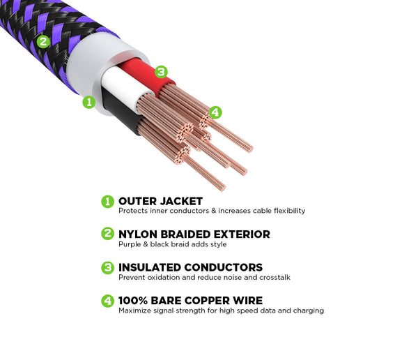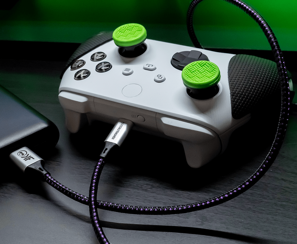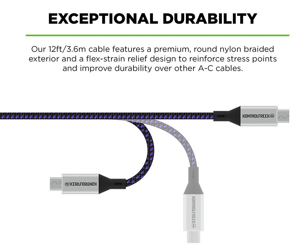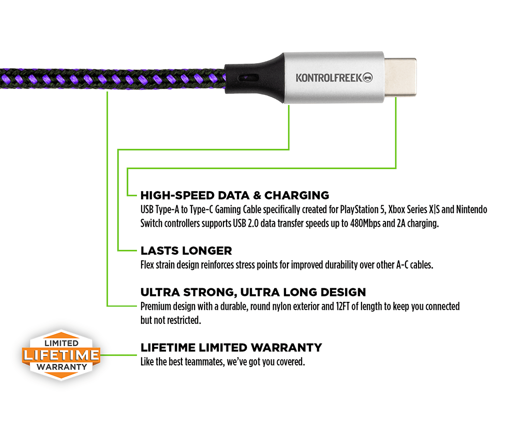 Our 12FT/3.6M USB Type-A to Type-C Gaming Cable™ was specifically designed to help gamers stay in charge of their Type-C compatible devices like PlayStation 5, Xbox Series X|S and Nintendo Switch. It supports USB 2.0 data transfer speeds up to 480Mbps and 2A charging. The stylish exterior features a durable black and purple nylon braid and a round construction to prevent tangling. The flex strain relief design reinforces stress points to increase the cable lifespan. It is compatible with all USB A-C devices. As an added bonus, it’s backed by KontrolFreek's Lifetime Limited Warranty. Our warranty covers any defects in materials or workmanship under normal use conditions, for as long as you own the cable.